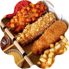 Beyond our famous donuts, we serve authentic, made-to-order Korean rice corn dogs, offering a satisfying crunch with customizable fillings and toppings.